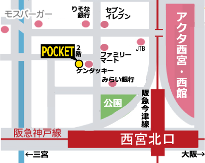 阪急西宮北口駅(北改札・北西出口)を 出て、左手の西出口の階段を下ります。広場を超え、右へ曲がった先にケンタッキーが見えてきます。 その角を左へ曲がった1つ目のビルの2階となります。オートロックの扉がございますので、ご来店の際はお手 数ですがインターホンを押して頂きますよう、お願い致します。入口が奥にありますので、わかりにくい場合はお電話下さいませ。